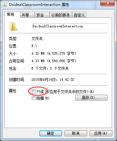 ,安装路径位置见安装步骤4,在文件夹“DsidealClassroomInteraction”上点击鼠标右键,选择“属性”,将“只读”勾选掉,如下图,点击“应用”即可。