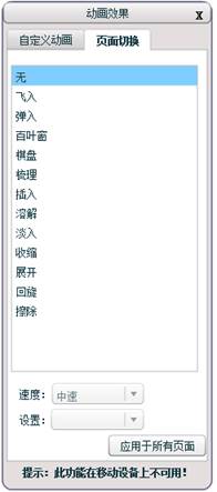 页面切换部分包括无、飞入、弹入、百叶窗等动画效果,当选中其中一种动画效果时,可以预览到当前页面应用此动画效果切换。