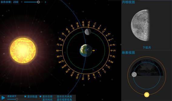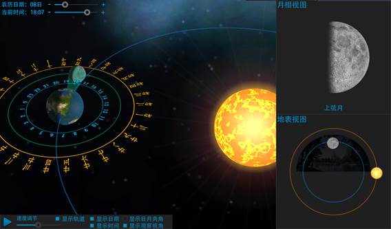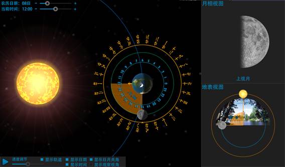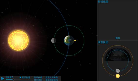 1. 显示日月夹角:勾选显示日月夹角,将在主视图和地表视图上同时显示太阳和月球之间的夹角,探究月相变化与日月夹角的关系和月相变化的成因;