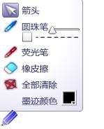 在文件编辑或播放状态下,都可使用此功能。单击内容显示区左下角的铅笔图标,即可出现屏幕书写工具菜单,包括箭头工具、圆珠笔、荧光笔、橡皮擦、全部清除和墨迹颜色六个功能选项。