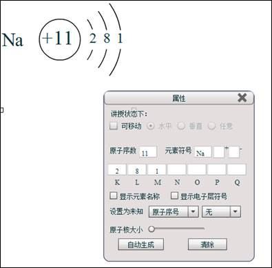 单击“结构示意图”按钮出现如下图所示界面,可以对属性表中的各项内容进行相应的属性设置,如显示输入符号及其化合价、原子序数、壳层结构等,当前结构示意图按照设置进行各项数值属性的变化,可以点击“自动生成”,对当前数值进行判断,如输入错误平台会提供相应正确的数据。单击“清除”后,可以重新设置属性。单击“结构示意图”按钮旁的“库”按钮,即可调用结构示意图典型案例库。案例库中的内容可以通过属性面板进行二次编辑。