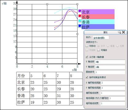 选中表格,将光标移到表格中任一格;单击右键,在“右键菜单”中单击“生成坐标曲线图”,会根据表格数据生成坐标曲线图。如下图