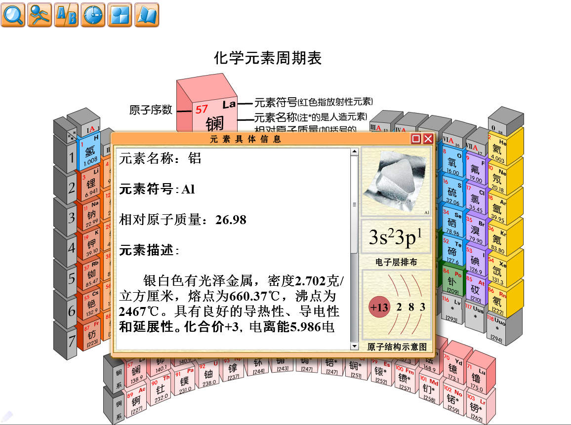 在主界面,点击任意元素,界面的上部的单个元素展示区即可展示该元素的原子质数、元素符号、元素名称、相对原子质量及该元素的具体信息包括:文字说明、实物图片展示、电子层排布和原子结构示意图。如下图所示铝元素:点击周期表中每列中处于最上方的族,即可展示该族各元素的核外电子排布。