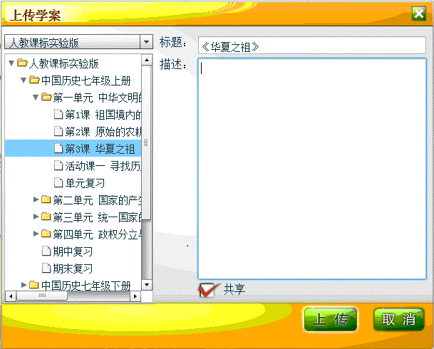 编辑好案例后,点击上传按钮,选择对应的版本、节点,修改标题名称,添加对课件的描述,上传。若勾选分享,则局域网上的其他用户也可以下载这个文件。