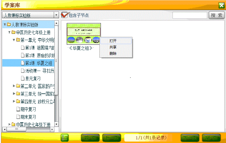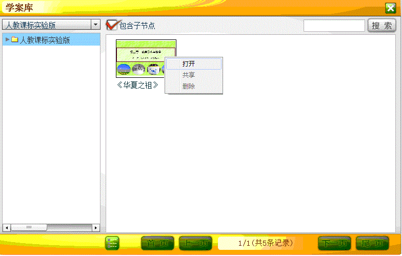 上传完成后,该学案就会被保存到学案库中。对于用户自己上传的文件,可以进行打开、共享、删除操作,而对于其他用户上传的文件只能打开使用。