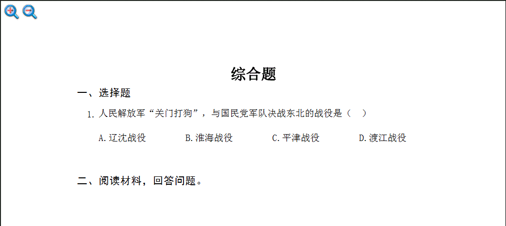 可以通过左上角的放大缩小按钮调整文档的纸张大小,插入的试题可以上下拖拽进行查看。在答题卡中选择不同题型的答题卡插入编辑界面右侧空白的位置即可。