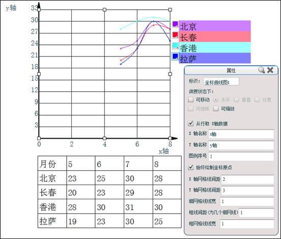 将鼠标光标移到表格中任一格,右键单击调出右键菜单,点击生成坐标曲线图功能,可自动根据表格中数据生成对应的坐标曲线图。右键单击坐标图,选择属性,可以对坐标的坐标轴、网格线的间距和粗细等做相应的设置。
