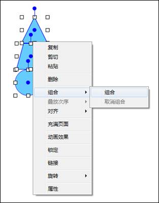 同时选中几个图形,在图形上右键单击,调出右键菜单,鼠标移动到“组合”文字上,即出现分菜单,左键单击分菜单中的组合功能,可以将选中的图形组合成一个整体。