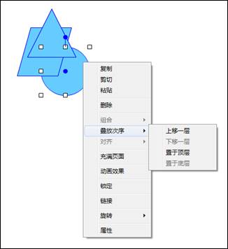 选中要编辑的图形后,右键单击图形,调出右键菜单后,鼠标移动到“叠放次序”文字上,即出现分菜单,可以选择将选中图片“上移一层”、“下移一层”、“置于顶层”或“置于底层”。