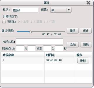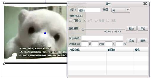 当讲授页面中有视频对象时,可以双击视频文件切换播放或暂停,点击旁边片段按钮自动播放对应按钮名字的视频片段,双击视频对象停止