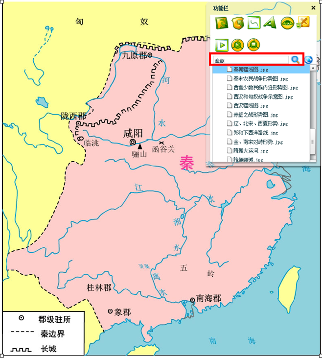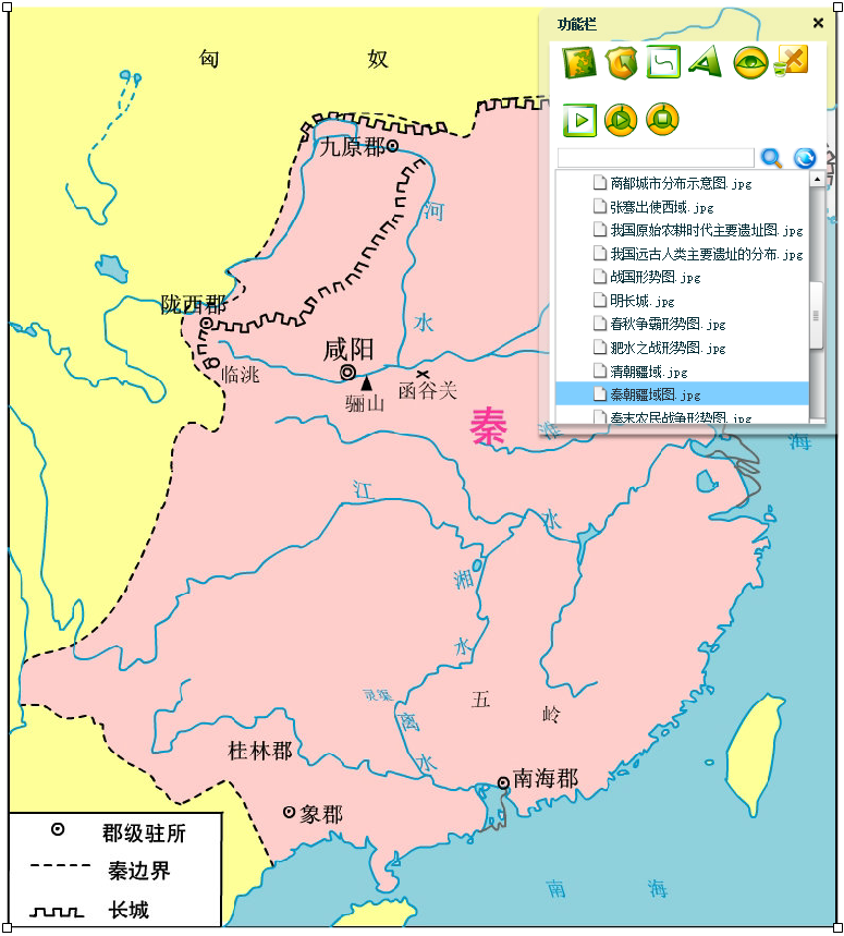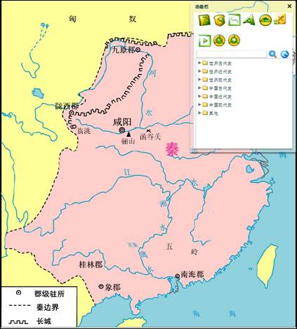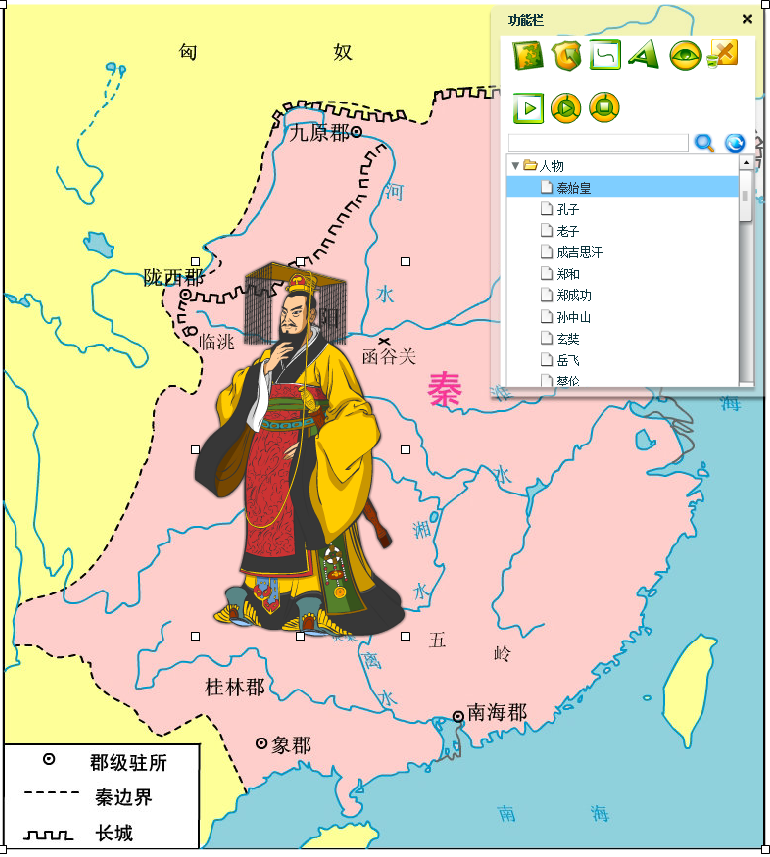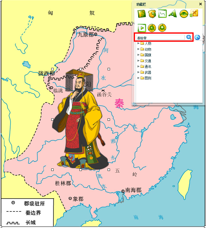 【标志】提供人物、动物、国旗、交通、通讯、武器和图例等标志,选择后双击鼠标即可在背景地图上出现,如选择秦始皇: