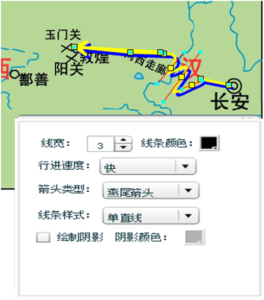 点击路线,可以通过属性设置改变路线颜色和样式、箭头样式、线条宽度以及添加并修改阴影等。如下图所示: