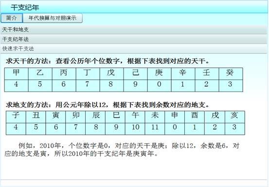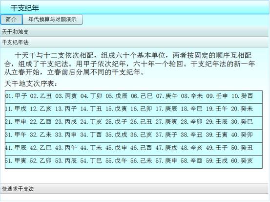 点击“干支纪年”按钮,主要介绍了天干、地支、天干地支纪年法以及快速算求干支纪年的方法,还提供了公元纪年与干支纪年的对照演示工具,方便用做常识掌握、随时进行纪年转换查询。