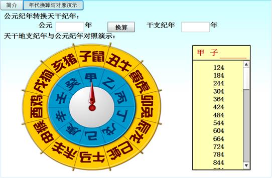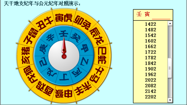 通过鼠标转动天干和地支罗盘,指针对应的干支纪年落定后,在右侧会出现相对应的多个公元纪年。如图所示: