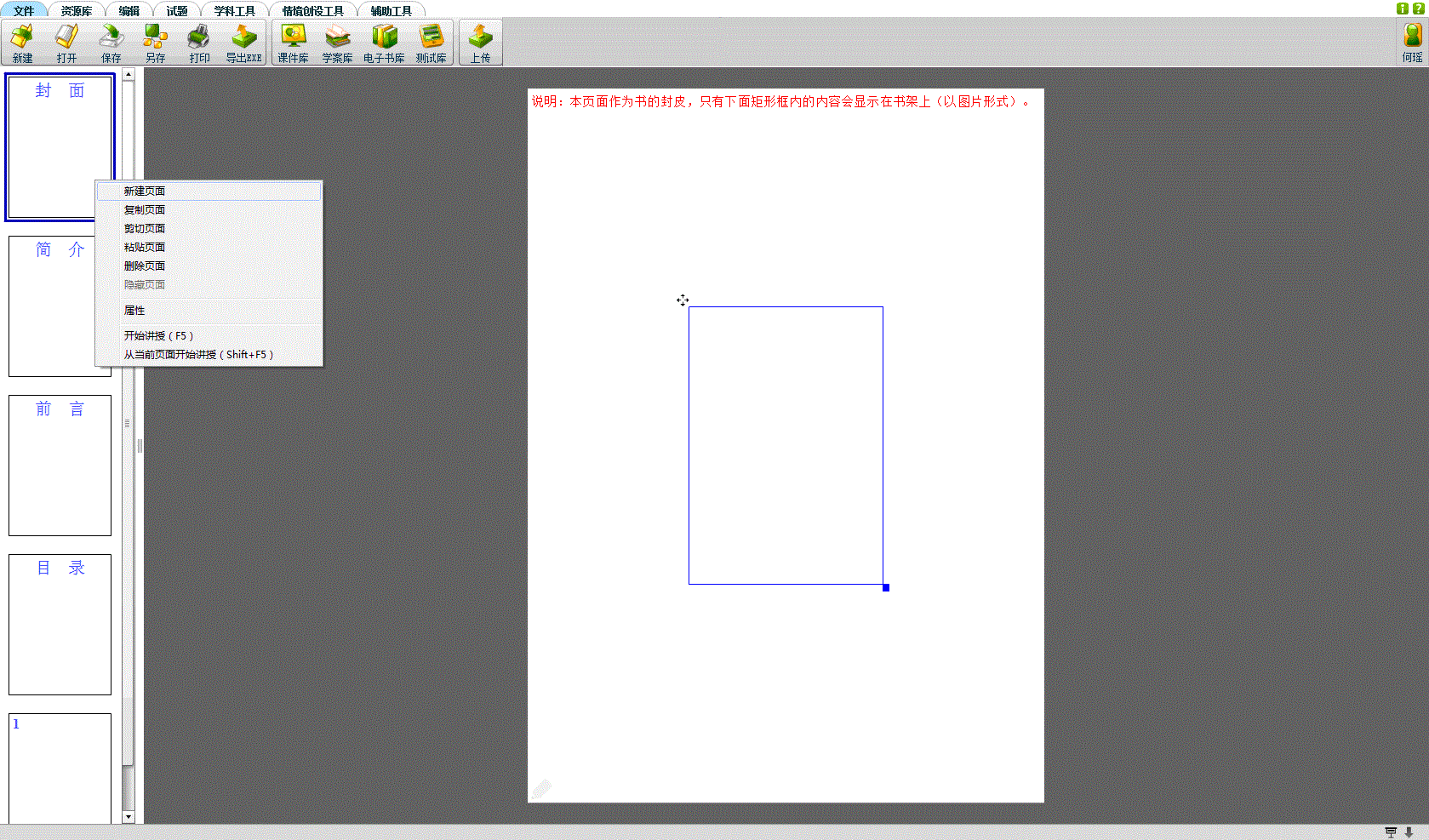可以在封面页蓝色框中插入图片、文字等内容,作为电子书的封皮。在简介页、前言页和正文页中,可以任意调用云平台中的资源和工具进行编辑,如插入文字、图片、动画、视频、音频等。