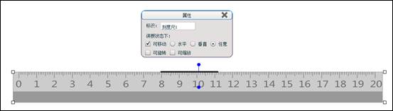 单击“刻度尺”按钮,页面上出现刻度尺,拖拽四个角落的白色矩形框可以对刻度尺的大小进行整体缩放、旋转等。沿着直尺的上边缘可以直接按住鼠标左键进行画线,画好线后单击鼠标右键选择“属性”,在弹出的属性框中对画好的线的线型、粗细、颜色等相关属性进行设置。