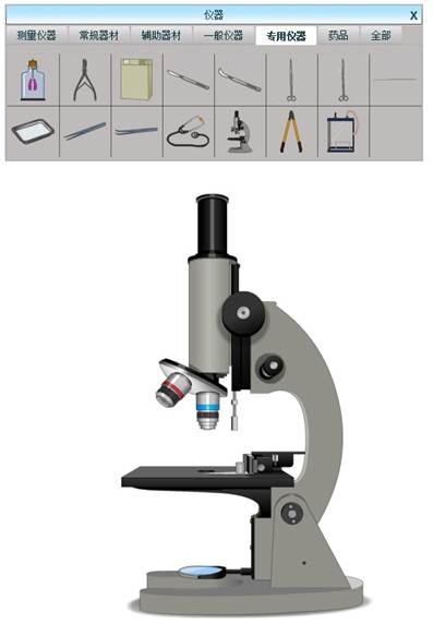 点击仪器按钮,弹出仪器图显示面板,包括测量仪器、常规器材、辅助器材、一般仪器、专用仪器、药品图形等,鼠标滑过图形时会出现该仪器的名称,选择任一仪器图鼠标左键单击即可添加到平台中。当将仪器添加到编辑区域后,在仪器图形的四周有若干个白色方框及两个蓝色圆点,白色方框可用来调整图形的大小,在中间的蓝色圆点上按住鼠标左键可以将图形进行旋转,旋转的中心即为左上角的蓝色圆点。