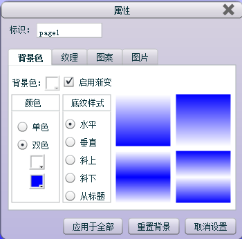 在“背景色”选项卡中,选中“启用渐变”选项后可以给页面添加渐变效果。