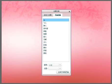 左键单击“应用于所有页面”按钮,则选中的页面切换效果将应用于所有页面的切换效果中。