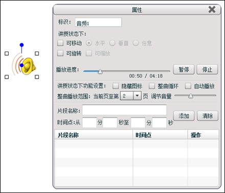 音频与视频的插入方式基本相同,找到想要播放的音频文件,打开,确定。这时在编辑区里出现一个小喇叭图标,双击这个图标,开始播放,再次双击停止。音频同样可以进行片断截取,打开属性面板,截取时间点的设置方法有两种,一种为通过鼠标拖拽到想要截取的位置,单击时间点,系统会自动记录该时间点,同样,结束的时间点也是一样的设置方式。另外一种方法是,我们可以直接在对话框中输入数值来进行时间点的确定。选择完时间点后,为该片段命名,然后点击添加按钮,会在画面中出现片段的名称标签,点击该标签则播放截取的相应片段。可以同时截取多个片段。我们还可以在这里设置隐藏图标、整曲循环播放、以及整曲播放的范围和调节音量。需要注意的是,能够进行标签设置的音频文件格式要求为mp3。其他格式的音频文件可以链接的方式插到平台中,但不能进行标签设置。