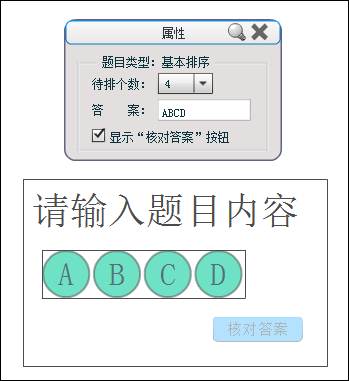 (2)设置属性:在属性框中设置需要排序的选项个数、正确答案(直接输入字母,如BAC)、是否显示“核对答案”按钮。