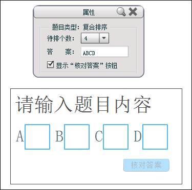 (3)设置属性:在属性框中可以设置排序的选项个数、正确答案(直接输入字母,如BAC)、是否显示“核对答案”按钮。