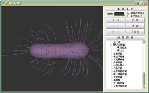细菌列表区中共有50种细菌,双击细菌名称后,该细菌的细分结构展开,可通过点击细分结构名称前的方框来控制该结构的显示与隐藏。选中某一细胞后,将操作命令区上方的显示信息栏勾选上可查看该细菌的相关信息。
