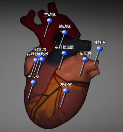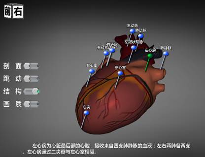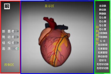 心脏模型页面可分为三列,功能控制区、心脏模型显示区、文字按钮区。