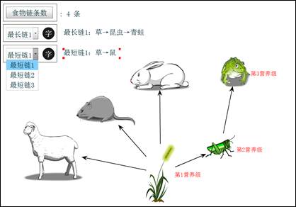 对于一个复杂的食物网系统,还提供了快速显示食物链条数,显示最长链、最短链的个数,每一条最长链、最短链的文字书写式等,并且能够根据页面中食物网的变化,同步更新以上三部分的相关信息。