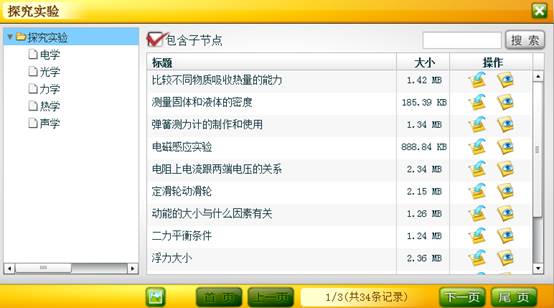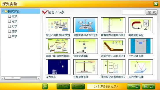 ,弹出探究实验面板, 左侧是知识体系结构,右侧是素材列表。