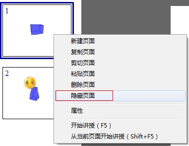 在软件界面左侧的缩略图预览区选中待隐藏的页面,在右键菜单中选择“隐藏页面”,讲授时即隐藏该页面,同时,右键菜单中的“隐藏页面”变为“显示页面”。