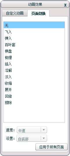 页面切换部分包括无、飞入、弹入、百叶窗等动画效果,当选中其中一种动画效果时,可以预览到当前页面应用此动画效果切换。