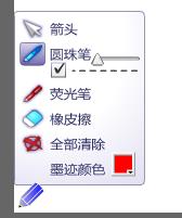 在文件编辑或播放状态下,都可使用此功能。单击内容显示区左下角的铅笔图标,即可出现屏幕书写工具菜单,包括箭头工具、圆珠笔、荧光笔、橡皮擦、全部清除和墨迹颜色六个功能选项。