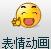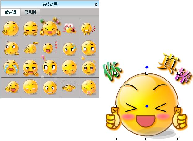 点击“表情动画”按钮,弹出黄色调和蓝色调两种色调的表情动画缩略图表,单击缩略图,添加表情动画。