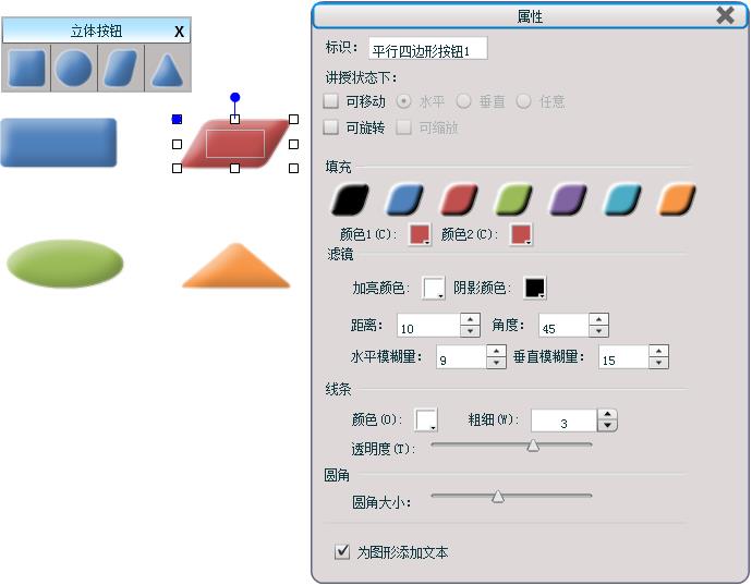 通过“属性”设置功能,可改变按钮的填充颜色、滤镜效果、线条颜色和粗细、圆角大小及是否为图形添加文本。