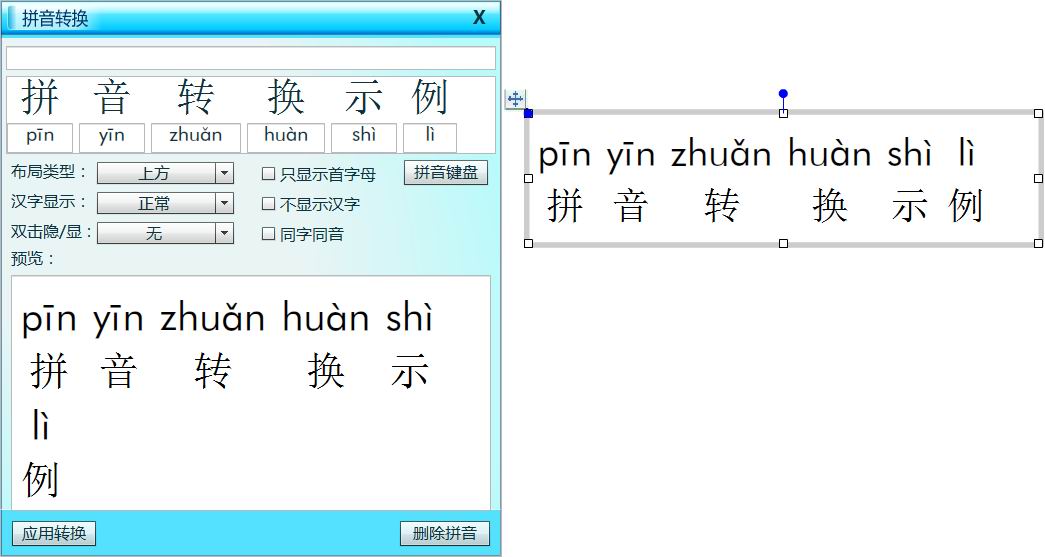 点击“拼音转换”按钮,弹出“拼音转换”设置页面,根据提示输入需要转换的文字内容,并设置其显示形式,点击应用转换,页面上即展示转换完成的文字。