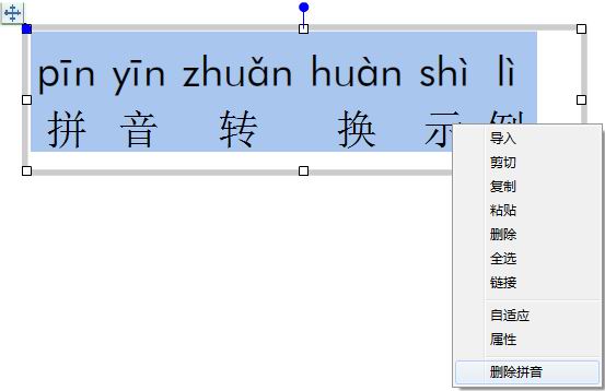 对已添加拼音的文字可删除拼音,有两种方式,一种用鼠标左键选中页面上已添加拼音的文字内容,然后点击,在点击弹出面板中的按钮即可;一种选中带有拼音元素的文本,鼠标右键删除拼音。