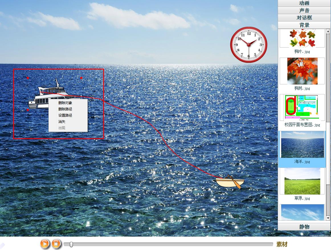 动画制作工具提供了初中语文学习所需生活场景的人物库、建筑物库、日常用品库、音效库、背景库;可设定对象的运动轨迹和速度、显隐效果等,能够在运动过程的不同点上添加配音、音效、文字等学习相关信息,能够支持多个对象同步运动,并可进行二次编辑,方便教师制作简单的动画,能够很好地满足情境化教学的需求。操作步骤如下: