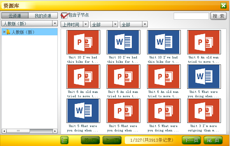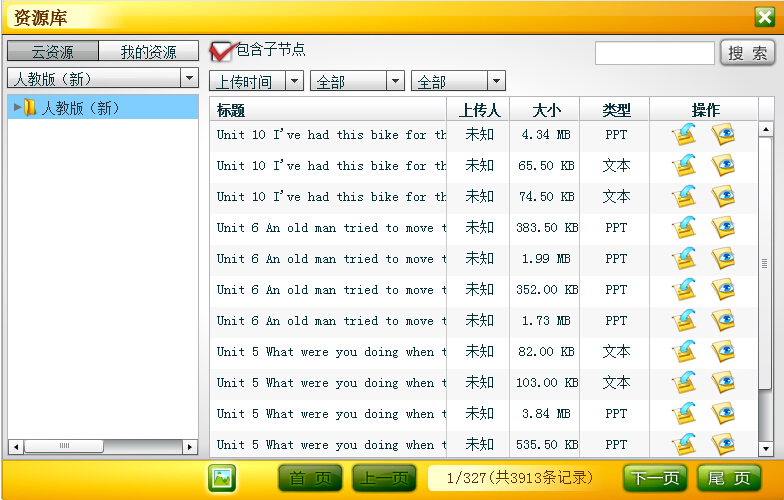 在登录状态下,可查看资源库中的资源。根据用户的需要,可随时切换成云版资源库中的公用资源和本人上传的私有资源,即“云资源”和“我的资源”。单击“人教版(新)”右侧的下拉箭头,可进行教材版本的切换;可点击左侧小三角