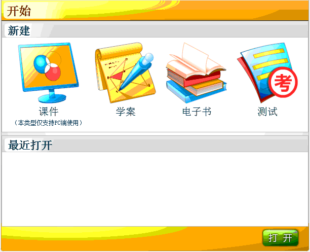利用云教学平台可以编辑不同类型的文件,包括课件,学案,电子书和测试,也可以打开用平台已经编辑好的文件。请注意,编辑好的课件文件只能在PC端使用,不能在平板电脑、pad等移动终端上使用,而其他三个文件没有使用终端的限制。