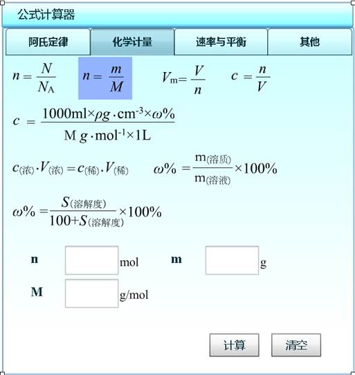 单击“公式计算器”按钮即可出现一个化学计算器。可根据实验要求,按照提供的应用公式快速的实现计算。