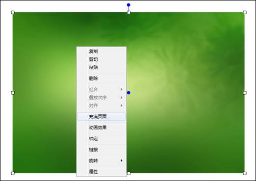 选中要编辑的图形后,右键单击图形,调出右键菜单后,左键单击充满页面功能,选中图片则自动调整为当前编辑页面大小。