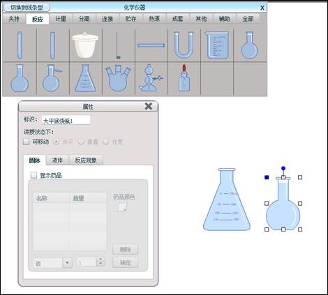 部分仪器的右键属性能对仪器进行各项属性的设置,如添加药品,容积的设定,各种反应行为等。如下图圆底烧瓶的右键属性及相关设置后的试管: