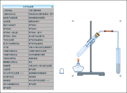 单击“装置”按钮出现装置图形列表,点击列表中的分类名称,即可看到此分类下的各种化学装置图的缩略图。单击缩略图,即在当前页面出现对应的化学装置图的放大图,可以实现对图像位置、缩放、旋转、组合等进行操作。
