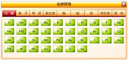 该软件能够将元素符号、化学式、离子式等快速插入文本中,点击属性面板相应物质名称,实现插入功能。如下图。