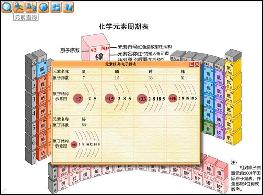 点击图标,进行元素查询,可从元素位置、原子序数、元素符号和元素名称四个方面进行元素的查询。例如对原子序数为11的钠元素的查询,可以通过下拉条用鼠标点击数字“11”也可通过手动输入数字“11”然后按回车键实现。