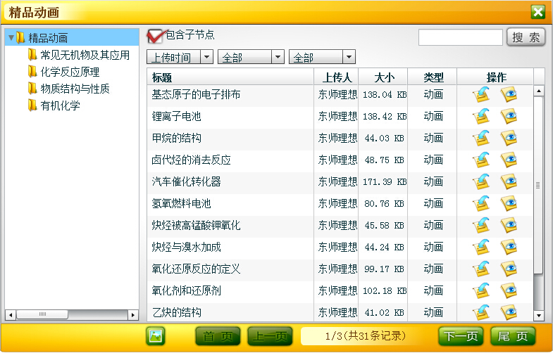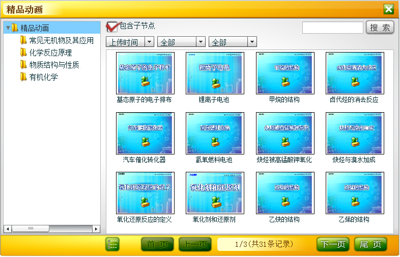 在登录状态下,可查看精品动画中的动画资源。可展开左侧目录结构按照知识节点进行查看,也可通过勾选右侧“包含子节点”查看任一节点下的动画资源。