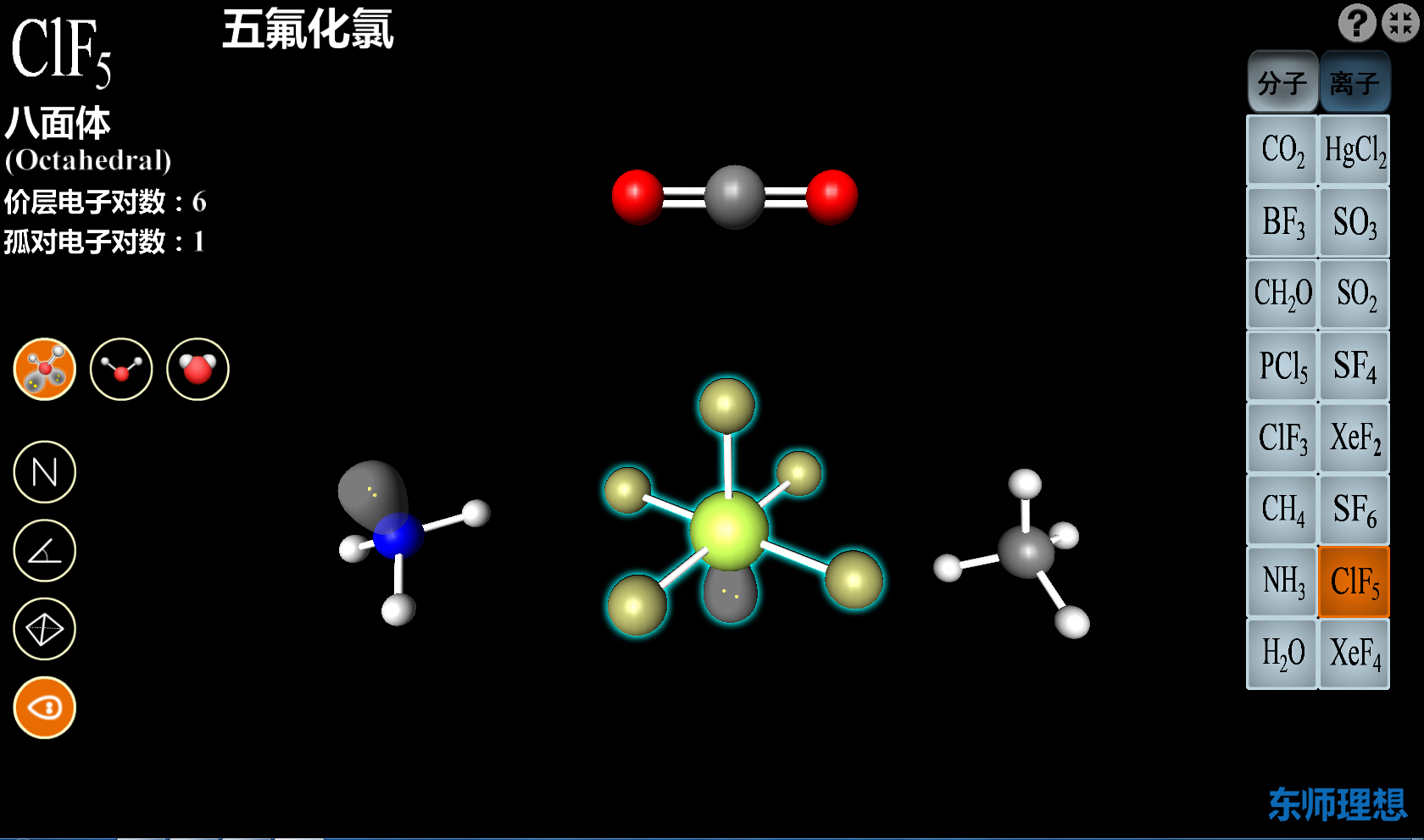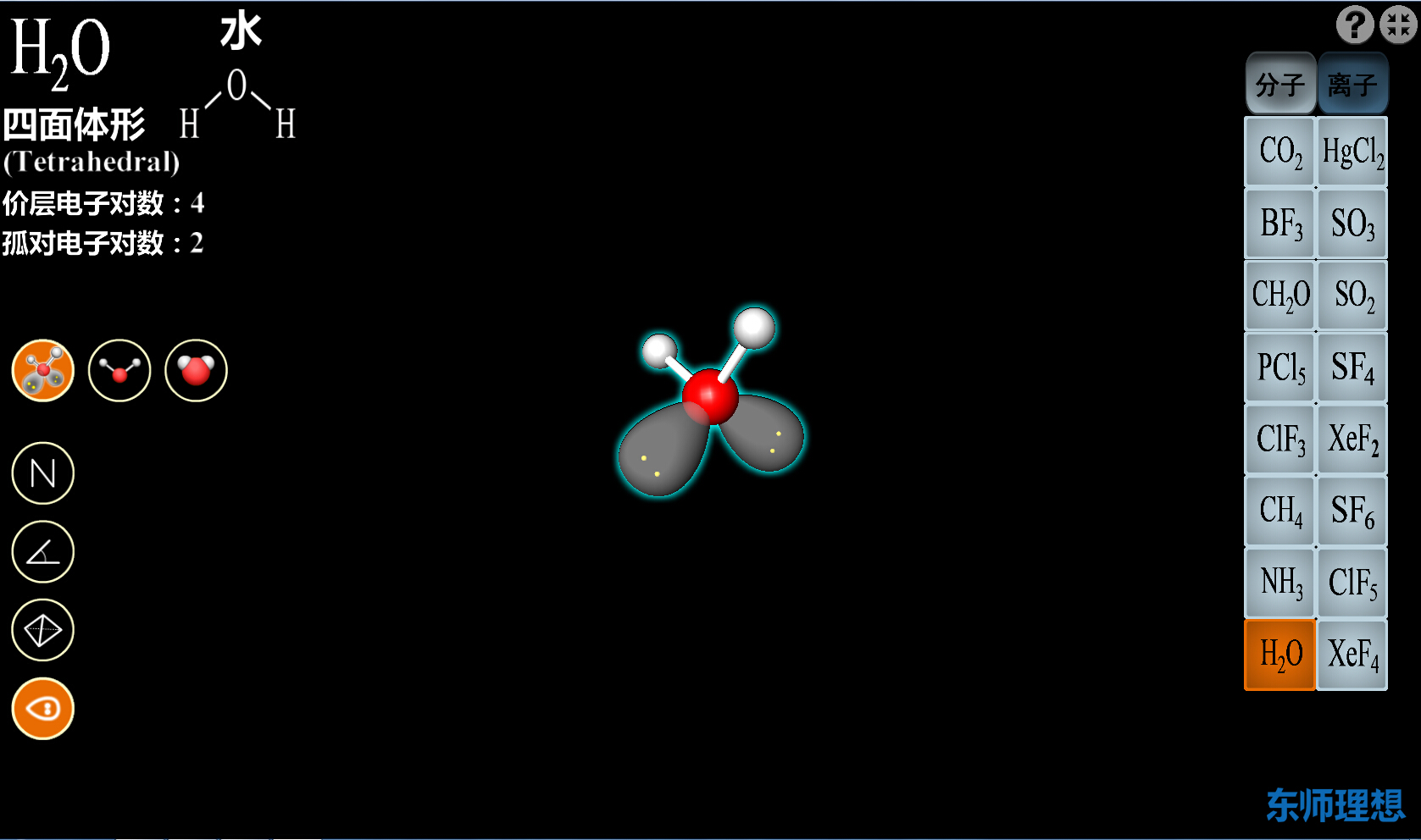 用户单击选择右侧区域的分子,则分子模型出现在主界面。鼠标左键选中分子模型,可任意拖动分子,实现模型的移动;点击空白处,可以旋转分子,从任意角度观看。转动滚轮实现模型的放大及缩小。另外,可以通过左侧按钮的点击查看相应分子的VSEPR模型、立体构型(球棍模型、比例模型)、键角、构型、元素名称、孤对电子。