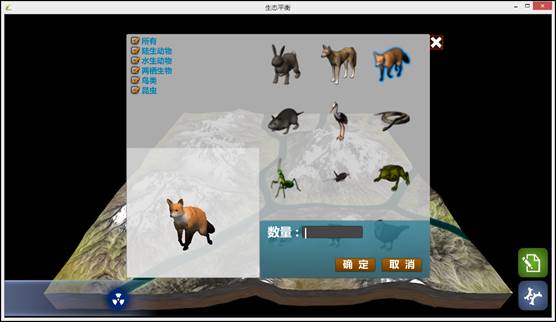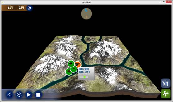 点击 按钮可查看生态系统内个组分的资料;点击 按钮可查看参考食物网;点击 按钮,系统还原到初始编辑状态;点击上方 按钮,可调节系统运行速度。