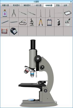 出现如下图所示的仪器图形选框,点击分类名称对应标签,即可看到此分类下的各种实验仪器的缩略图。